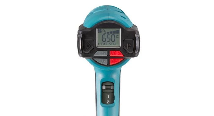 Pistolet à air chaud électronique à débit d’air réglable en 5 positions et large plage de température à réglage thermostatique.