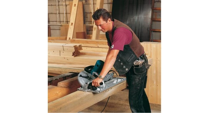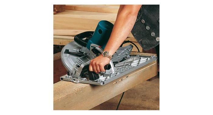 Scie circulaire à main robuste et puissante pour le débit de grosses sections de bois (jusqu’à 12 cm d’épaisseur).